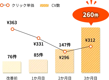 前業者からの引き継ぎに伴い、広告設定を丸っと再構築。設定するキーワードも半分以上減らし、限られた予算の中でターゲティングを整備することで、最も単価が安く獲得できるユーザー層を確立。