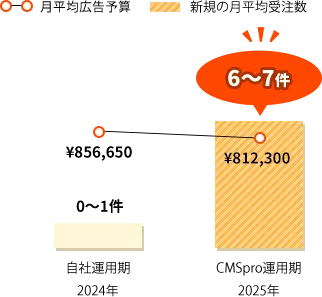自社での運用体制からの切り替え。CMSproではLP制作と広告設計を一から見直し、全く違う形で広告をスタート。3ヶ月目頃から徐々に軌道に乗り、年間比較で成約数は8培以上、会社設立から過去最高売上を記録。