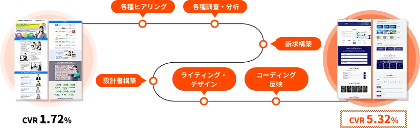CMSproが制作するLPは確実にCVRを向上させます。それは、LPの設計・構築の過程に確立されたノウハウがあること、これまでの制作LPが悉く成果改善につながっていることが理由です。LPの設計やデザインで重要なのは、見栄えやお洒落さではありません。本質を突いたLPを共に作り上げましょう。