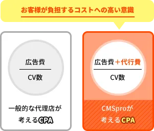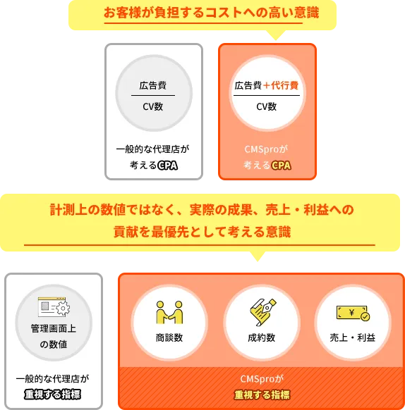 CMSproでは広告上の成功は成功とは捉えず、売上・利益の向上が成功であると明確に認識しています。また、そのためには「売上増加」でけではなく、「コストの削減」も同じように重要です。この両面を強く意識し、売上・利益の向上を見据えた勝てる戦略と目標設計にて運用していきます。